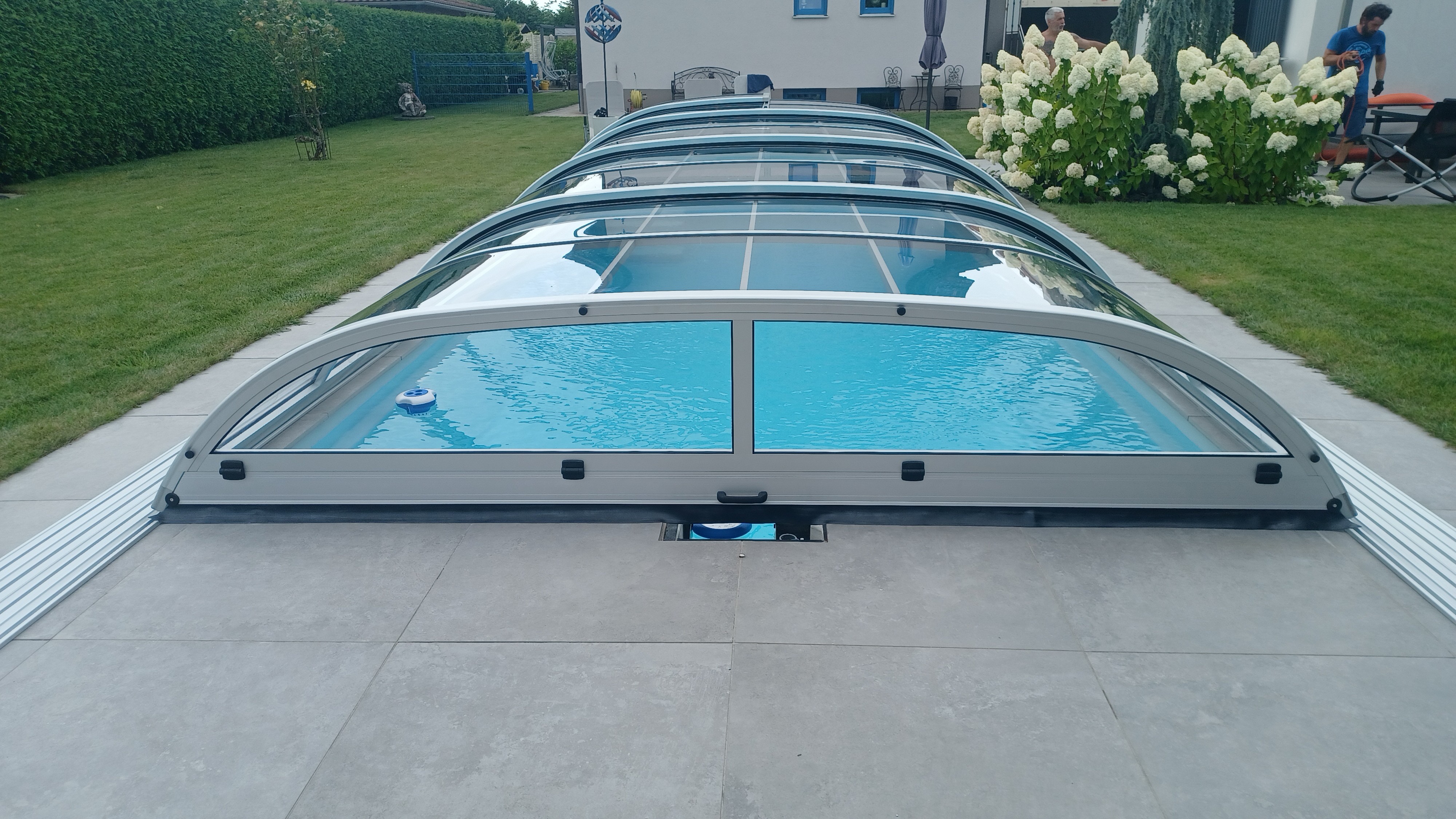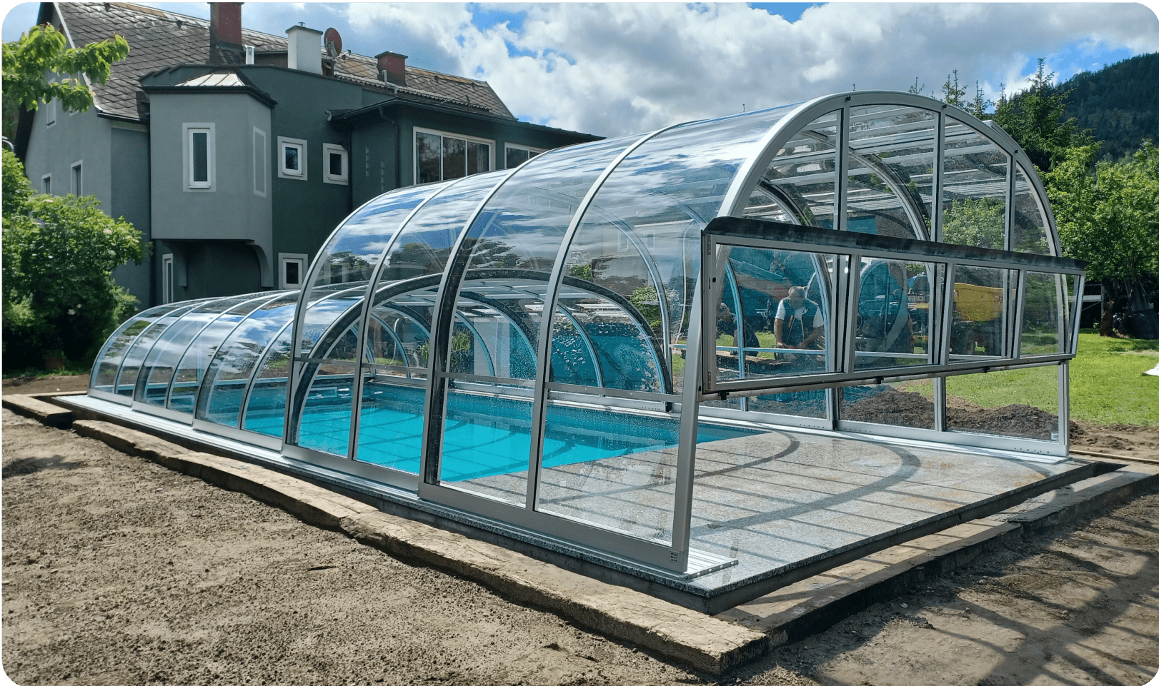 Unsere elegante, halb-runde Polycarbonat-Poolüberdachung mit erhöhter Bauweise. Die großzügige, gewölbte Konstruktion sorgt für mehr Kopfhöhe und Raumgefühl, schützt zuverlässig vor Witterung und Schmutz und schafft ein ansprechendes, modernes Ambiente. Die Form erlaubt komfortables Ein- und Ausfahren über eine stabile Schienenführung — ideal, wenn Funktionalität und stilvolle Optik gleichermaßen gefragt sind.